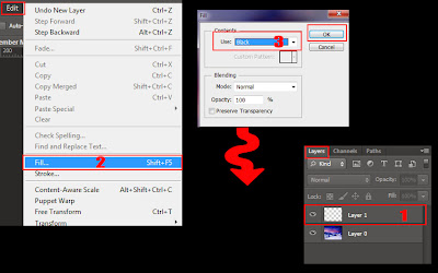 2. Create a new layer on the Layers panel: Shift + Ctrl + N. Select the Edit drop-down menu < Fill. Choose Black in the Fill window.